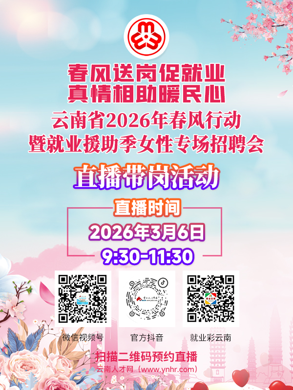 3月6日9:30——11:30通過云南人才市場(chǎng)微信公眾號(hào)(視頻號(hào))、抖音、就業(yè)彩云南(微信視頻號(hào))將同步開展直播帶崗活動(dòng),介紹本場(chǎng)招聘會(huì)情況、參會(huì)單位、招聘崗位、薪酬福利等。